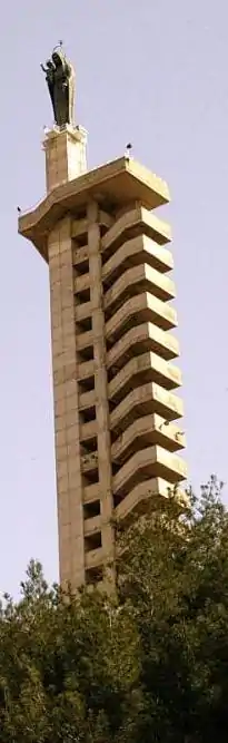 Located on a hilltop to the Southwest of Zahlé, this is a 54 m (177 ft) high concrete tower, entirely clad in white marble, and topped with a 10 m (33 ft) high bronze statue of the Virgin Mary, the work of an Italian artist. It is by far Zahlé's most prominent structure, it is visible from most of the city and from several miles around in the central Bekaa Valley. At its base is a chapel that can seat a little over a hundred people. The top of the tower features sweeping views over Zahlé and the Bekaa valley.