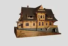 The Zakopane style also gained popularity beyond the Polish highlands.[3] In the Warsaw area, attempts were made to adapt the style to brick construction.[3] Examples include Czeslaw Domaniewski's design for a series of train stations and the design for a townhouse located at 30 Chmielna Street in the center of Warsaw.[3] In 1900, the young Kraków-based architect Franciszek Mączyński won an international architectural competition organized by the Paris-based magazine "Moniteur des Architectes" with a design of a villa in the Zakopane style.[3] There was also the Chata built for author Stefan Żeromski in Nałęczów, a series of villas in Wisła as well as in Konstancin and Anin and a brick tenement by Jan Starowicz dubbed "Beneath the Góral" in Łódź,[4] as well as the train station in Saldutiškis, Lithuania.[5]