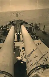 The Zara-class cruisers saw extensive service during World War II, having taken part in several sorties to catch British convoys in the Mediterranean as the flagship of the 1st Division.[12] At the Battle of Calabria in July 1940, torpedo bombers from the British aircraft carrier HMS Eagle attacked the Zara-class cruisers, but they failed to score any hits. The ships steamed ahead to the front of the Italian line of battle and joined the attack on the leading British battleship, Warspite, but they scored no hits. British cruisers attacked as the Italians withdrew, but heavy fire from the Italian cruisers drove them off.[13] All four ships escaped damage at the Battle of Taranto in November 1940.[12] In March 1941 at the Battle of Cape Matapan, Pola was immobilized by a torpedo from a Swordfish torpedo bomber launched by the British aircraft carrier HMS Formidable; Zara and Fiume were detached from the rest of the fleet to protect Pola, and all three and a pair of destroyers were sunk in a close-range night engagement with the battleships Barham, Valiant, and Warspite.[12] Italian casualties were very heavy, with 783 killed aboard Zara, 328 killed aboard Pola, 812 aboard Fiume.[14] The survivors, mostly from Pola, were rescued primarily by British destroyers, though Greek destroyers and an Italian hospital ship picked up others over the following few days.[15][16][17]