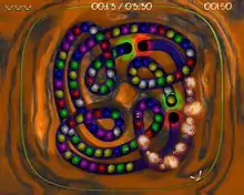Unlike Zuma, where the player shoots new balls from a center point, in Zaz the player moves a grabber on a separate track on the playfield to grab a ball that can then be shot back at a new location.[4][5] Instead of inserting randomly assigned new balls, the player moves existing balls.[6]