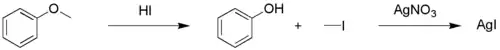 By heating this mixture, the gases are allowed to come into contact with a piece of paper higher up the test tube saturated with silver nitrate. Any alkyl iodide present will give a reaction with the silver compound to silver iodide which has a red or yellow color. By filtering and weighing this precipitate it is possible to quantitatively calculate the number of iodine atoms and hence alkoxy groups. For example, prior to the development of the more precise methods of NMR spectroscopy and mass spectrometry, the Zeisel test was widely used to determine the number of methoxy (-OCH3) and ethoxy (-OCH2CH3) groups in carbohydrate and organophosphorus insecticides.[5]