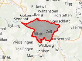 Zell is situated in the upper Töss Valley. In Zell-Rikon is a Tibetan monastery, the Tibet Institute Rikon. The municipality also includes the hamlet of Kollbrunn.
