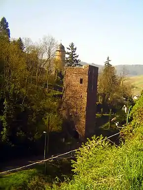 - Town Wall – six-floor "Bachturm" (tower), converted to a gate tower in 1899, inside the tower a Heiligenhäuschen (a small, shrinelike structure consecrated to a saint or saints), pietà, 18th century; before the tower a graveyard: wayside cross marked 1741, three grave crosses marked 1632, 1643 and 1805 as well as three-floor "Pulverturm" (tower), "tail cupola" after 1689; on Hauptstraße remnants of a gateway arch