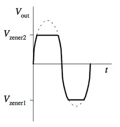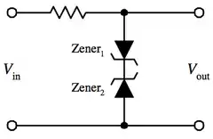 Two Zener diodes facing each other in series clip both halves of an input signal. Waveform clippers can be used not only to reshape a signal, but also to prevent voltage spikes from affecting circuits that are connected to the power supply.[10]