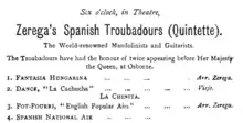 In England in 1888, they billed themselves as "The Zerega Spanish Troubadours", consisting of "two on mandolin and guitar, with tambourine, castanet and fairy-bell accompaniments", appearing at the Royal Albert Hall, West Theatre.[10] They also toured as "Zerega's Spanish Minstrels".[2] On August 17 and 21 August 1895, "These famous Mandoline and Guitar Players, Singers, and Dancers had the honour of appearing before her Majesty the Queen [Victoria] [at] Osborne House",[11] and performed the following programme:[12]