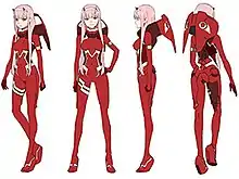 Zero Two is an elite pilot originally belonging to the special forces unit with an infamous reputation as the "Partner Killer" due to none of her previous co-pilots having survived past three rides.[15] As an artificially-created hybrid between humans and klaxo sapiens (a cybernetic dinosaur-like species which inhabited the Earth millions of years ago),[6] she possesses superhuman abilities such as increased strength and rapid regeneration.[16] Commonly viewed by others as a monster, Zero Two possesses bestial physical characteristics such as two small red horns and fangs.[17] She began to pursue her ambition to become fully human after meeting the protagonist Hiro in her youth, and frequently questions the meaning of humanity.[18] Zero Two has a confident and assertive personality, as well as being consistently rebellious towards the collectivist, quasi-theocratic world government depicted in the series.[19][20]