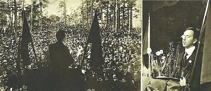 At the May Day demonstration in 1903, Höglund and Fredrik Ström had an invitation to speak from the Social Democratic Party on a demand for 8-hour workdays. Höglund started and was followed by Ström, who suddenly started agitating for 6-hour workdays, and even promising 4-hour workdays in a socialist future.