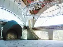 Fadıllıoğlu is the interior designer of the Şakirin Mosque in Istanbul, combining modern techniques with traditional Islamic art.[4] Her contributions include a large metal sphere above the entrance, a graceful curved minbar and a glass chandelier crafted in China. Conscious of the need to pay special attention to women, she has ensured that the women's upper gallery matches the men's area of the mosque in both size and beauty. It is separated from the rest of the mosque only by criss-crossed rails. The chandelier consists of globules shaped like drops of water, recalling a prayer that Allah's light should fall like rain. The large windows have gold designs reminiscent of pages from the Quran. The overall impression is one of light, space and elegance. The mosque was built in memory of Ibrahim and Semiha Şakir by their descendants. Zeynep Fadıllıoğlu is in fact their great-niece.[5][6]