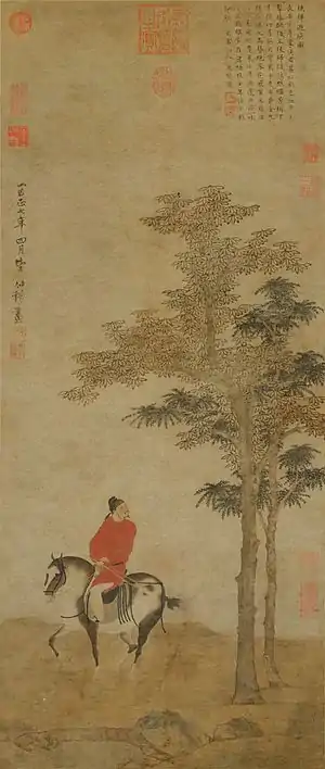 Zhao Yong (simplified Chinese: 赵雍; traditional Chinese: 趙雍; pinyin: Zhào Yōng; Wade–Giles: Chao Yung; style name Zhongmu (仲穆); 1289 – c. 1360), was a noted Chinese painter, calligrapher, and poet in the Yuan Dynasty. A native of Wuxing (吳興, now Huzhou (湖州) in Zhejiang Province), he was the second son of Zhao Mengfu.[1] Zhao was a descendant of the Song Imperial family, the House of Zhao.