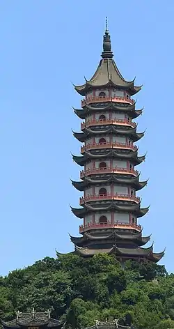 The Zhaobao Mount Scenic Area includes walking trails on and around the hill with numerous sites to explore during a visit. These include the 57.6-metre-tall (189 ft) seven-story Aozhu Pagoda, the 2,000-foot-long (610 m) 10-foot-thick (3.0 m) Weiyuan City Wall built during the Ming Dynasty, and the even older Zhenhai Seawall originally built in 897 CE during the Tang Dynasty. Sanskrit rock carvings, including a Buddhist prayer chant, are one of the oldest features of the hill. The Tianhou Temple is dedicated to the Heavenly Empress (see also Mazu) and the Guanyin Pavilion is dedicated to the Goddess of Mercy (see also Guan Yin). The mountain is named after the sea god Zhāobǎo Qīláng, a forerunner of the more recent sea deity Qianliyan, a subordinate of the goddess Mazu.