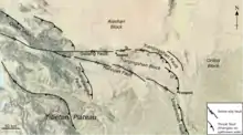 The Zhongwei-Tongxin fault or Tianjingshan fault is an arcuate sinistral (left-lateral) strike-slip zone, forming one of the major structures on the northeastern margin of Tibetan plateau. Six paleoearthquake events in the past 14,000 years have been recorded along the Zhongwei-Tongxin fault zone.[1] Among the earthquakes recorded are the 1622 North Guyuan earthquake, which had a magnitude of 7.0 and mid-seismogenic depth of about 15 kilometres (9.3 mi),[2] the 1709 Zhongwei earthquake, which had a magnitude of 7.5.[1]
