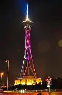 Zhongyuan Tower, also known as Henan Radio and Television Tower, is located in Zhengzhou, China. It is a multi-functional commercial, artistic and cultural center integrating radio and television broadcasting, tourism, cross-border trade, cultural performance, catering and leisure.[4] The tower measures 268 metres (879 ft) high and the top antenna is 120 metres (390 ft) high, with a total height of 388 metres (1,273 ft).[5] It is the world's second tallest steel tower after the Tokyo Skytree.