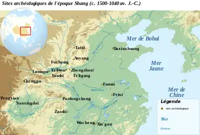 The war took place in the middle Yangtze region, which was dominated by marshes, swamps, and mountains,[7] but still very fertile[23] and extremely rich in ores like gold,[24] copper and tin.[25] As result of its natural wealth, the area not only spawned several highly developed Neolithic cultures,[23] but also garnered the attention of the peoples living in the Central Plain. Subsequently, many northern cultures attempted to expand into the middle Yangtze region, aiming to exploit its mines.[26] The most prominent and successful northern intruders belonged to the Erligang culture, commonly associated with the Shang dynasty. The Shang appear to have taken control of large swaths of the region around 1500 BC,[25] even though they never controlled all eastern Hubei.[27] With Panlongcheng as their local center, the northerners politically and culturally dominated the local populace,[28] while they mined the middle Yangtze deposits in order to supply the bronze production of the Shang cities on the Central Plain.[26] Among the most important mines were Tonglüshan and Tongling in Huangshi, both directly south of the Yangtze.[29] According to later historiographies, the Shang also established several minor states in the region, among them E and Zeng.[30]