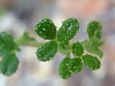 Zieria adenophora is an openly branched shrub which grows to a height of 0.5–1 m (2–3 ft) and has its branches covered with many small warty tubercles. The leaves are strongly aromatic and are composed of three leaflets, each leaflet wedge-shaped to egg-shaped, about 2.5–4 mm (0.1–0.2 in) long and 2–3 mm (0.08–0.1 in) wide with a stalk about 2 mm (0.08 in) long. Both surfaces of the leaves are warty and mostly glabrous.[2][3][4]