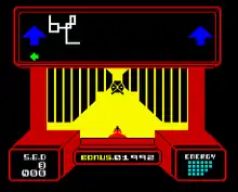 The first-person 3D effect was achieved by using a series of vertical black lines to form the perspective of the walls, and to give the impression of the ceiling and floor. This also allowed relatively smooth movement animation, particularly when the player rotates left or right. However, some reviewers found the stripes to be an eye-strain.[3]