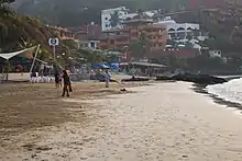 The ring of beaches of Zihuatanejo Bay begins with the Municipal Beach which is in front of the town center and next to the port. From there, there is a cement and sand walkway that leads to Playa Madera (Wood Beach).[4][23] It is a 2-kilometer (1.2 mi) stretch of light-colored sand between the municipal beach and Playa La Ropa.[3] The waves here are gentle with the occasional wave.[3][25] This beach contains a number of bay-view restaurants, bungalows, condominiums and hotels, as well as a walkway that extends the length of the beach. Part of the beach is covered in pebbles.[25]