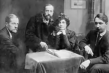 In 1901 Gippius and Merezhkovsky co-founded the Religious and Philosophical Meetings. This 'gathering for free discussion', focusing on the synthesis of culture and religion, brought together an eclectic mix of intellectuals and was regarded in retrospect as an important, if short-lived attempt to pull Russia back from the major social upheavals it was headed for.[13] Gippius was the driving force behind the Meetings, as well as the magazine Novy Put (1903–04), launched initially as a vehicle for the former. By the time Novy Put folded (due to a conflict caused by the newcomer Sergei Bulgakov's refusal to publish her essay on Alexander Blok), Gippius (as Anton Krainy) had become a prominent literary critic, contributing mostly to Vesy (Scales).[12]