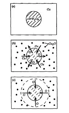 While complex oxides containing Cu, Zr, and W were believed to be created, selected area diffraction (SAD) of the ceramic product has proven the existence of Cu2O as precipitates after reaction. A model consisted of two concurrent processes were surmised (as presented): (b) the decomposition of the ceramic and loss of oxygen under low oxygen partial pressure at high temperature leads to Cu2O formation; (c) copper diffuses into the ceramic and forms new oxides that absorb some oxygen upon cooling.