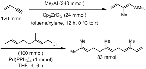 Zirconocene dichloride catalyzes the carboalumination of alkynes by trimethylaluminum to give a (alkenyl)dimethylalane, a versatile intermediate for further cross coupling reactions for the synthesis of stereodefined trisubstituted olefins. For example, α-farnesene can be prepared as a single stereoisomer by carboalumination of 1-buten-3-yne with trimethylaluminum, followed by palladium-catalyzed coupling of the resultant vinylaluminum reagent with geranyl chloride.[5]