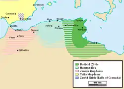 Continuing their conquests to Fez and much of modern-day Morocco in 980, the Zirids encountered resistance from the local Zenata Berbers, who gave their allegiance to the Caliphate of Cordoba.[8][12][13] Various Zirid branches did however rule the central Maghreb and during their reign the Zirids were able to gain control over territories from the Atlantic coast of Morocco to Ajdabiya in Libya as well as control over territory in Spain and suzerainty over the Emirate of Sicily.[14][15][16][17] One branch of the Zirids, at the beginning of the 11th century, following various family disputes, broke away as the Hammadids and took control of the territories of the central Maghreb. The Zirids proper were then designated as Badicides and occupied only Ifriqiyah between 1048 and 1148.[18] Part of the dynasty fled to al-Andalus and later founded, in 1019, the Taifa of Granada on the ruins of the Caliphate of Cordoba.[10] The Zirids of Granada were again defeated by the expansion of the Almoravids, who annexed their kingdom in 1090,[19] while the Badicides and the Hammadids remained independent. Following the recognition of the Sunni Muslim Abbasid Caliphate and the assertion of Ifriqiya and the Central Maghreb as independent kingdoms of Sunni obedience in 1048, the Fatimids reportedly masterminded the migration of the Hilalians to the Maghreb. In the 12th century, the Hilalian invasions combined with the attacks of the Normans of Sicily on the littoral weakened Zirid power. The Almohad Caliphate finally conquered the central Maghreb and Ifriqiya in 1152, thus unifying the whole of the Maghreb and ending the Zirid dynasties.[12]