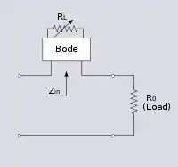 A Bode network, as with a Zobel network, is a symmetrical bridge T network which meets the constant k condition. It does not however meet the constant resistance condition, that is, the bridge is not in balance.[4] Any impedance network, Z, can be used in a Bode network, just as with a Zobel network, but the high pass section shown for correcting high-end frequencies is the most common. A Bode network terminated in a variable resistor can be used to produce a variable impedance at the input terminals of the network. A useful property of this network is that the input impedance can be made to vary from a capacitive impedance through a purely resistive impedance to an inductive impedance all by adjusting the single load potentiometer, RL. The bridging resistor, R0, is chosen to equal the nominal impedance so that in the special case when RL is set to R0 the network behaves as a Zobel network and Zin is also equal to R0.