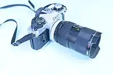 Canon AE-1, a 35mm camera with a zoom lens. The advantage of a zoom lens is the flexibility, but the disadvantage is the optical quality. Prime lenses have a greater image quality in comparison.