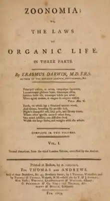 Zoonomia; or the Laws of Organic Life (1794-96) is a two-volume medical work by Erasmus Darwin dealing with pathology, anatomy, psychology, and the functioning of the body. Its primary framework is one of associationist psychophysiology.[1] The book is now best remembered for its early ideas relating to the theory of evolution, specifically forms of developmentalism similar to Lamarckism.[1][2] However, despite Erasmus Darwin's familial connection as grandfather to Charles Darwin, the proto-evolutionary ideas in Zoonomia did not have a lasting influence.[3][4]