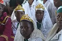 The women in Zulu society often perform domestic chores such as cleaning, raising children, collecting water and firewood, laundry, tending to crops, cooking, and making clothes.[9] Women can be considered as the sole income-earner of the household. A woman's stages of life lead up to the goal of marriage. As a woman approaches puberty, she is known as a tshitshi. A tshitshi reveals her singleness by wearing less clothing. Single women typically do not wear clothing to cover their head, breasts, legs and shoulders.[9] Engaged women wear hairnets to show their marital status to society and married women cover themselves in clothing and headdresses.[9] Also, women are taught to defer to men and treat them with great respect. The women are always bound by a male figure.[9]