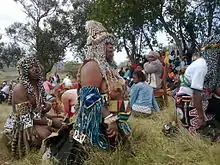 The Zulu people celebrate an annual event that was established in 1984 called the Umhlanga or Reed Dance. This event takes place at the royal capital near Nongoma.[8] This traditional ceremony is performed by young women from all parts of the kingdom to perform in front of the monarch and his guests.[8] The purpose of this event is to promote pride in virginity and to restrain sexual relationships.[9] Beadwork is a prominent attire that is worn at the Umhlanga. The beadwork is not only worn by the dancers, but by the guests as well. The Umhlanga is not purely for a time of dance. The King also uses this time to speak to the young men and women of the nation. The King discusses current political issues.[8]