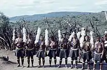 The Zulu people govern under a patriarchal society.[9] Men are perceived as the head of the household and seen as authoritative figures. Zulu men identify themselves with great pride and dignity. They also compare themselves to qualities of powerful wild animals such as bulls, lions and elephants.[9] The men contribute to society by acting as defenders, hunters, and lovers.[9] The Zulu men are also in charge of herding the cattle, educating themselves on the lives of disciplined warriors, creating weapons, and learning the art of stick fighting.[9]